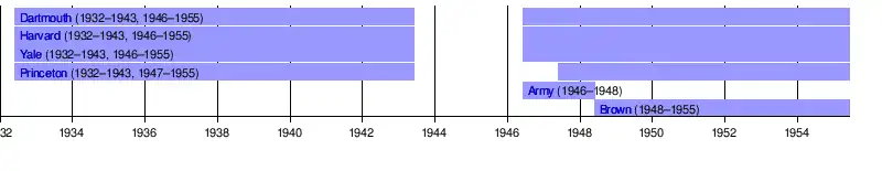 The four team league remained in place until 1943 when both Harvard and Princeton suspended their ice hockey programs due to America's participation in World War II. The league resurfaced after the war and was expanded by the addition of Army for the 1946–47 season, becoming the Pentagonal League. The Cadets left the league after two seasons and were promptly replaced by Brown. The league continued in this fashion until 1955, a year after the Ivy League was formally created.