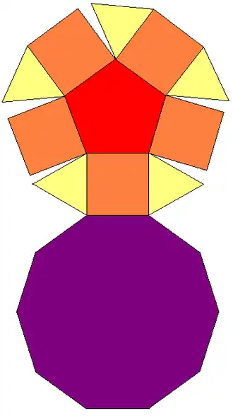 | Faces | 5 triangles 5 squares 1 pentagon 1 decagon |