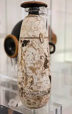 A white-ground alabastron from the 6th century BCE depicts Penthesilea as being courted by a female Thracian hunter. It appears to be a reversal of a common male courtship scene in Athenian art, where a suitor gifts a token of affection – typically a rabbit – to his beloved.[25]