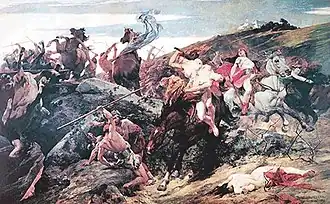 In the 4th century AD, the imperial Greek poet Quintus Smyrnaeus made Penthesilea the subject of the first book in Posthomerica. In this epic, Smyrnaeus tries to finish Homer by telling the colourful story of how the city of Troy fell.[16] This work explains how Penthesilea came to be at Troy: Penthesilea had killed Hippolyta with a spear when they were hunting deer; this accident caused Penthesilea so much grief that she wished only to die, but, as a warrior and an Amazon, she had to do so honorably and in battle. She therefore was easily convinced to join in the Trojan War. Smyrnaeus also describes in gory detail how the army of Amazons surprises the Greek army and the slaughter that commenced. The Amazon Klonie, after slaying her first opponent, is in turn killed. Penthesilea mows through the Greek lines, killing eight warriors, and cuts the arm off the Greek warrior who had killed Klonie. Penthesilea's Amazon comrades Bremusa, Evandre and Thermodosa fight valiantly alongside her but are slain, and so are Derinoe, Alkibie and Derimachea. Penthesilea slays more Greeks with axe and spear. From the towers the Trojan women watch and Penthesilea inspires the young Hippodamia, who urges the Trojan women to join the battle.[17] Antimachus' daughter Tisiphone gives an inspirational speech: "not in strength are we inferior to men; the same our eyes, our limbs the same; one common light we see, one air we breathe; nor different is the food we eat. What then denied to us hath heaven on man bestowed? O let us hasten to the glorious war!"[18][19]