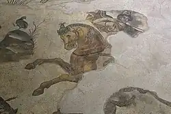 According to Pausanias, the throne of Zeus at Olympia bore a painting by Panaenus of the dying Penthesilea being supported by Achilles. Pausanias wrote "And, at the extremity of the painting, is Penthesilea breathing her last, and Achilles supporting her".[22] The motif of Achilles supporting a dying or dead Penthesilea has been preserved at the Temple of Aphrodisias and was reinterpreted in sculptures and mosaics in ancient Rome.[23]