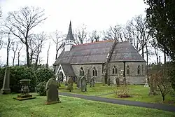 St Nicholas' Church was built as a chapel of ease to the parish church of St Andrew's at Kirkandrews on Esk, 5 miles (8 km) to the south-west. The current St Nicholas' Church was designed by Alexander Graham and built in 1866–1867, replacing an earlier chapel.[5] The building has a small wooden bell turret with a spire. The stained glass windows were made by John Scott & Son; a five light east window depicts Christ the good Shepherd, flanked by the four evangelists.[6][7][8]