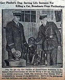 Before his incarceration, Pep was given as a gift from Maine governor Percival Baxter, who had many dogs, to Pennsylvania governor Gifford Pinchot. One of Baxter's dogs named "Governor" had successfully lived alongside inmates in a Maine prison, and Governor Pinchot was inspired to do the same with Pep.[2] Upon Pep's incarceration, international newspapers seized upon the murder reported in Pep's police record and publicly declared him "cat murderer." Governor Pinchot and his wife Cornelia adamantly denied Pep's murder accusation, calling it a "slanderous and unjustified attack on his reputation" and a "wretched tale." The governor received hundreds to thousands of letters from as far as the Philippines protesting Pep's unfair incarceration and demanding Pep's freedom. Governor Pinchot assured the public that Pep was not a prisoner and lived a good life at the penitentiary running the grounds, chasing rats through prison corridors, and fulfilling his life's mission of becoming a friend to all.[2] He was put on a diet in 1927 because inmates gifted him too much food. When he became old and tired, he moved to the Graterford Prison Farm, where he died in 1930.