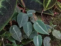 Peperomia eburnea is a species of flowering plant in the family Piperaceae native to Colombia and Ecuador.[1] It has a creeping or trailing growth habit, and grows in wet tropical biomes. Its foliage is green, and often has a single white stripe, along with red spotted backs of the leaves.[2] Sodiro, who collected the type specimen for this species, described the red-mottled variant as maculata,[3] but this variety is not scientifically accepted.
