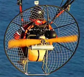 To keep the design as light as possible a simple harness is used. The single cylinder, two-stroke, fan-cooled aircraft engine incorporates some unique features that make it especially suitable for its role. Its reduction gearbox results in the engine and propeller turning in different directions, thereby reducing the resulting torque absorbed by the pilot . The engine also incorporates a centrifugal clutch that allows the engine to idle without the propeller turning, which improves safety during canopy inflation and launch, as well as landing.[1][2]