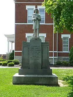 In 1825, it was decided that a more permanent building was needed to house the county court and administration, so a contract was let for the first courthouse. Funding of the $1,486.25 (1825 dollars) project came from the sale of 55 lots of property deeded to the county by Bernard Layton. No known illustrations of the structure exist. By 1859, a growing county created a need for more space. The court appropriated $8,000 (1859 dollars) for construction and appointed John E. Layton as superintendent of the construction.[5] The two-story building was completed in 1861. The site of the building was on the northeast corner of the square. The building continued in use until after the turn of the century. Grand jury reports from that time indicated the condition of the building was beyond repair. After county residents presented a petition calling for an election on September 1, 1903, voters approved a proposition for a $30,000 bond issue to finance a new courthouse. From several plans submitted in November, the court selected the proposal of Caldwell and Drake, Columbus, Indiana, who were then contracted for construction. Construction began in February, 1904. The cornerstone ceremonies were conducted on June 4, 1904. The total cost on the red brick, 65-by-92-foot building was $31,819. The county continues to use the courthouse for county court and administration purposes.[2][6][7] The building was listed on the National Register of Historic Places in 2016.[1]