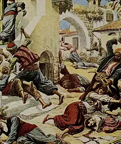 The eyewitness account of Strategius of St. Sabas narrates: "Jews ransomed the Christians from the hands of the Persian soldiers for good money, and slaughtered them with great joy at Mamilla Pool, and it ran with blood."[92] The Sulha al-Quds, the treaty of Jerusalem's capitulation to Muslim forces in 638, can only be understood in the context of the massacre at Mamilla. In it, the Christian Patriarch Sophronius of Jerusalem required that the Arab ruler Umar protect the people of Jerusalem from the Jews.[92] From the many excavations carried out in the Galilee, it is clear that all churches had been destroyed during the period between the Persian invasion and the Arab conquest in 637. The church at Shave Ziyyon was destroyed and burnt in 614. Similar fate befell churches at Evron, Nahariya, 'Arabe and monastery of Shelomi. The monastery at Kursi was damaged in the invasion.[94]