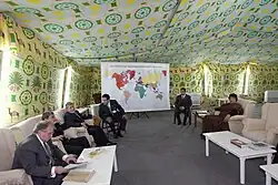 He was preoccupied with his own security, regularly changing where he slept and sometimes grounding all other planes in Libya when he was flying.[36] He made particular requests when travelling to foreign countries. During his trips to Rome, Paris, Madrid, Moscow, and New York City,[37][38] he resided in a bulletproof tent, following his Bedouin traditions.[37][39] Gaddafi was notably confrontational in his approach to foreign powers[40] and generally shunned Western ambassadors and diplomats, believing them to be spies.[11]