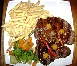 A local staple is Lomo Saltado, also known as saltadito. Sliced beef (tenderloin or in Spanish "lomo") is stir-fried with, garlic, cumin powder, tomato and Spanish onion and fried-mixed with already fried French cut potatoes, coriander and parsley and accompanied with white rice. Salt and black pepper is also added to taste.