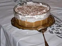Suspiro a la Limeña: Is another Spanish-influenced dessert that uses dulce de leche, which derives from the Spanish Blancmange. The bottom layer is made of dulce de leche enriched with egg yolks. The top layer consists of meringue made with port wine. This classic criollo dessert is said to have been named by the famous Peruvian poet and author José Gálvez whose wife doña Amparo Ayarez was famous for her cooking. When asked what inspired the name, he reportedly replied, "Because it is soft and sweet, like the sigh of a woman." In this case, it would be a woman from Lima, a Limeña.
