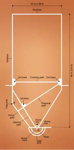 - When entering a base, the runner only has to cross the line of the base; there are no actual cushion bases like in baseball, only lines on the field showing each base's boundaries (A much larger area compared to the bases used in baseball). Similarly, the pitcher or the fielders in the bases do not have any plates to touch to make an out; having only a foot in the base is enough.