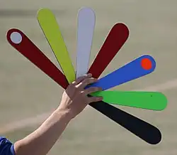 - The attacking team uses a colour-coded fan to signal the runners when to move. The fan is multicoloured, held by the coach of the team. Colour sequence is decided prior to the game.