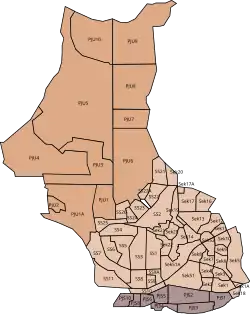 Petaling Jaya is divided into several sections. Some are subdivided into smaller neighbourhoods (kejiranan), for example SS5D. Some sections have their own names (SS1 as Kampung Tunku), while other sections are grouped together (SS3, SS4, SS5, SS6 and SS7 as part of Kelana Jaya). Besides that, Petaling Jaya also comprises the affluent township of Damansara. SS is not the same as Seksyen but as the short acronym for Sungai Way-Subang instead.[22]