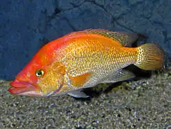 This piscivorous species can reach a length of 50 centimetres (20 in) SL.[2] These fishes have a laterally compressed body, with an elongated head and a prominent jaw. The fins are large and rounded. The basic coloration varies from pale pink to deep red to gold. Males are a bit larger than females, with a more accentuated red coloration. Females are usually rounder.[3] The special feature of this species is in the jaws that are extensible to more than 1/4 of the length of the entire body, which allows to prey fishes of considerable size but also to suck small fishes directly into the mouth.