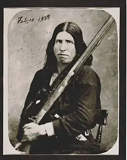 Perhaps gold fever, or just wanderlust, took Peter Britt from Illinois to Oregon in 1852, following the completion of his naturalization process.[5] Britt left Illinois with John Hug and two other Swiss men heading west on the Oregon Trail. Britt was elected captain of the wagon train, John was the wagon master, and the group made it to Grande Ronde Valley before the men insisted on no longer dealing with Britt's 300 pounds of photographic equipment. John Hug split the wagon train into two halves. At The Dalles, Oregon, John Hug and Britt chose an overland route to Portland, while the other two men chose the Columbia River route and arrived in Portland, Oregon, just 24 hours later. Finally, Britt, hearing news of the gold mining strike in Table Rock City (now Jacksonville, Oregon), left Portland alone for southern Oregon. According to Alan Clark Miller, he arrived to the gold-mining camp of Jacksonville with the two-wheeled cart, a yoke of oxen, a mule, and five dollars in his pocket.[6][3]: 18
