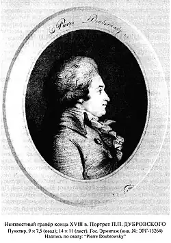 Peter Petrovich Dubrovsky (Russian: Пётр Петрович Дубровский; December 9, 1754, in Kyiv – January 9, 1816, in Saint Petersburg), was a Russian bibliophile, diplomat, paleographer, secretary of the Russian Embassy in France, collector of manuscripts and books. Throughout his life he collected about 2000 manuscripts.[3] Between 1805 and 1812 he worked at the Imperial Public Library.
