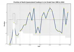 North Queensland started the 2023 NRL season poorly which saw the club only winning three of their opening ten games. In round 12, the club suffered one of their worst defeats losing 66–18 against the Wests Tigers. In round 18, North Queensland recorded the third biggest victory in Australian rugby league history defeating the Wests Tigers 74–0. It was also the largest victory of the NRL era.[14] North Queensland would finish the 2023 NRL season in 11th place and miss the finals. In the final round of the season, the club had the chance to make the finals if they were able to beat Penrith but the North Queensland side came up short losing 44–12.[15] In the 2024 NRL season, North Queensland would finish 5th on the table and qualify for the finals. After defeating Newcastle in the elimination final, the clubs season would be ended the following week by Cronulla in the semi-final.[16]