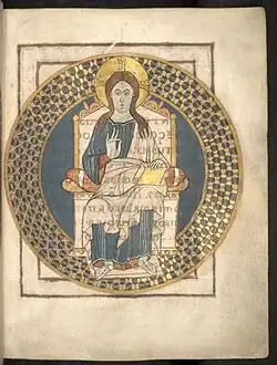 The miniature on folio 40 originally opened the manuscript and has been the subject of much debate. It displays attributes of the Virgin Mary and Ecclesia (personifications of the church), but differs from usual representations of either. Her regalia does not follow Northern iconography, being closer to Roman depictions of the Maria Regina. Her necklace and earrings recall the prependoulia of Byzantine crowns, while her patterned tunic and mantle give the appearance of Byzantine silks.[1] Consistent with earlier depictions of Byzantine empresses, Anton von Euw interpreted the image as an "Imperial Virgin" and suggested it may have been inspired by Theophanu, the Byzantine princess who married Otto II.[2]