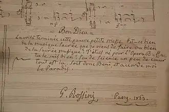 The composer's inscription at the end of the composition, «Bon Dieu. La voilà Terminée cette pauvre petite Messe. Est-ce bien de la musique Sacrée que je viens de faire ou de la Sacrée musique ? J'étais né pour L'Opera Buffa, tu le sais bien ! Peu de Science un peu de cœur, tout est là. Sois donc Béni et accorde moi Le Paradis. G. Rossini, Passy. 1863.»