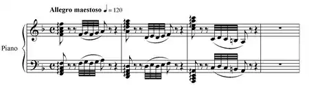 The work opens in A minor, with two chords marked pppp, extremely soft. The piano then begins an ostinato motif which remains present throughout the rest of the A sections of the movement.[22] A continuous flow of sixteenth notes appears in a pattern of the first sixteenth note in each beat played in octaves by the left hand (often including the third and fourth sixteenth notes, especially at the start), while the remaining sixteenth notes appear as chords in the right hand (often syncopated).[f] The harmonium introduces motifs repeated by the chorus. The voices pick up a slowly rising line on the word "Kyrie", marked sotto voce, in imitation: first tenor and bass, a measure later alto, a measure later soprano. The word "eleison" appears in contrasting homophonic chords marked forte, but smorzando to piano for the repeats of the word.[23] A second appellation begins in measure 18 in C major, marked pppp for "Kyrie" but with another sudden forte and decrescendo for "eleison".[24]