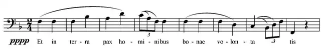 The acclamation "Sanctus" (Holy) appears three times, sung by the choir, each time more intense than before.[45] "Pleni sunt coeli et terra" (Full are heaven and earth) begins as a canon of the choir voices, beginning forte and ending softly.[46] "Hosanna in excelsis" (Hosanna in the Highest) is sung by pairs of soloists in unison.[47] For "Benedictus qui venit in nomine Domine" (Blessed who comes in the name of the Lord), the choir presents a soft melody in triplets.[47] The sequence is repeated in different harmonic development and with the soloists taking over the "Benedictus" section. The movement culminates in a strong eight-part affirmation of "in excelsis".[48]
