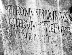 From 28 August 439 to 14 March 441, Maximus held the praetorian prefecture of Italy, the most important administrative and judicial non-imperial position in the Western Empire, and succeeded in that office by Anicius Acilius Glabrio Faustus.[13][14] He was awarded a second consulship in 443. In 445, he was granted the title of patrician, the empire's senior honorific title, which was limited to a very small number of holders.[15] During this year he was briefly the most honoured of all non-imperial Romans until the third consulate of Flavius Aëtius, generalissimo, or magister militum, of the Western Empire, the following year.[9] Between 443 and 445 Maximus built a forum, the Forum Petronii Maximi,[16] in Rome, on the Caelian Hill between the via Labicana and the Basilica di San Clemente.[12]