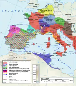 Petronius Maximus was born about 397.[1] Although he was of obscure origin, it is believed that he belonged to the Anicius and Petronius families.[2] Related to the later Emperor Olybrius, Maximus was the son of Anicius Probinus,[3] and the grandson of Anicia Faltonia Proba and Sextus Claudius Petronius Probus,[4] who was prefect of Illyricum in 364, prefect of Gaul in 366, prefect of Italy from 368 to 375 and again in 383 and consul in 371.[5][6] Procopius claimed that he was a descendant of Emperor Magnus Maximus, but historians such as J. B. Bury consider this account "untrustworthy and improbable".[7][8]