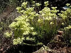 Specimens of Petrosedum sediforme have been found with varying chromosome counts, including 2n=32/48/60/64/96.[1] Diploid forms (2n=32) are generally confined to lowland environments. Hexaploids (2n=96) predominantly inhabit mountainous areas, whereas tetraploids (2n=64) show no distinct habitat preference. A striking cristate form, propagated from seed, has been introduced in horticulture.[2] A naturally occurring hybrid between Petrosedum forsterianum and P. sediforme was discovered in Portugal and described in 2015 as Petrosedum × estrelae.[3]