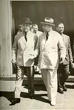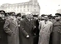 Groza became Premier in 1945 when Nicolae Rădescu, a leading Romanian Army general who assumed power briefly following the conclusion of World War II, was forced to resign by the Soviet Union's deputy People's Commissar for Foreign Affairs, Andrei Y. Vishinsky.[2] During Groza's tenure, Romania's King, Michael I, was forced to abdicate as the nation officially became a "People's Republic". Although his authority and power as Premier was compromised by his reliance upon the Soviet Union for support, Groza presided over the onset of full-fledged Communist rule in Romania before eventually being succeeded by Gheorghe Gheorghiu-Dej in 1952 and became the President of the Presidium of the Great National Assembly until his death in 1958.[2]