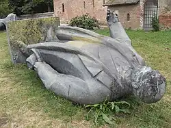 A 4.5 m (15 ft) bronze statue of Groza, placed on a red Carrara marble pedestal, was unveiled in Deva in 1962. The monument, designed by sculptor Constantin Baraschi, was removed in 1990, and replaced in 1999 by a statue of Trajan; in 2007, Groza's statue was transported to Băcia.[30] Another statue of him, sculpted by Romulus Ladea, was inaugurated in the Cotroceni neighborhood of Bucharest in 1971; this statue was taken down in 1990, and replaced in 1993 by a monument to the Artillery Heroes.[31] As of 2010, it lies in an open field near Mogoșoaia Palace, next to a statue of Vladimir Lenin that used to be in front of Casa Scînteii.[32]