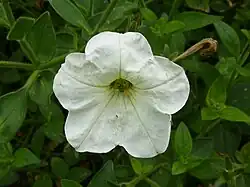 Petunia axillaris, the large white petunia,[1] wild white petunia or white moon petunia,[2] is an annual herbaceous plant in the family Solanaceae, genus Petunia.[3] It is native to temperate South America comprising southern Brazil, parts of Argentina and Uruguay. The plant's flowers, the only white ones found in the Petunia genus, are 3 to 7 cm long.[4] The commonly-grown garden petunia is a hybrid of P. axillaris and P. integrifolia.[5]