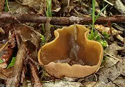 Peziza arvernensis, commonly known as the boring brown cup fungus or fairy tub,[2] is a species of apothecial fungus belonging to the family Pezizaceae. The ascocarps appear as cups, growing up to 8 cm (3+1⁄8 in) across.[2] Their exterior is pale tan and the interior is brown.[1] Peziza vesiculosa and P. violacea are similar, young specimens of the latter having a violet hue.[1]