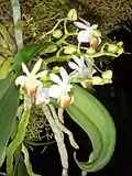 Phalaenopsis lobbii, also known as 罗氏蝴蝶兰 (luo shi hu die lan) in Chinese, is a species of orchid found from the eastern Himalaya to Indochina.It is named in honour of Cornish plant hunter Thomas Lobb. These epiphytic plants have aerial, fleshy, dorsiventrally flattened roots, which radiate from a short stem, which is inclosed by leaf petioles. The stem bears 3-5 slightly fleshy, thin leaves, which are commonly shed in winter. Some plants retain up to two leaves, but most exhibit deciduous leaflessness. Small flowers with reflexed petals of 1.5 cm in diameter are produced between March and May on racemose inflorescences. The midlobe of the labellum shows brown colouration.[12][13] It is a rare species with extremely small population sizes. It is found in evergreen broad leaved forests on limestone at altitudes of 150–330 m.[14]