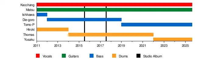 The band has been through 4 lineup changes. In 2012, bassist Ishikawa left the band. He was replaced by Die-goro, already in the same year. Die-goro was the band's bassist until 2019, and was replaced by Tomo-P, who is their current bassist. In 2014, drummer Hiroki left the band. He was replaced by Thomas in the same year, who was later replaced by Yusaku, the current drummer.[1]