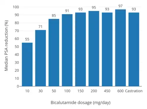 Whereas testosterone is the major circulating androgen, DHT is the major androgen in the prostate gland.[57] DHT levels in circulation are relatively low and only approximately 10% of those of circulating testosterone levels.[57] Conversely, local concentrations of DHT in the prostate gland are 8- to 10-fold higher than circulating levels of DHT.[58][32] This is due to high expression of 5α-reductase in the prostate gland, which very efficiently catalyzes the formation of DHT from testosterone[58] such that over 90% of intraprostatic testosterone is converted into DHT.[59][60] Relative to testosterone, DHT is 2.5- to 10-fold as potent as an AR agonist in bioassays, and hence, is a much stronger androgen in comparison.[61] As such, AR signaling is exceptionally high in the prostate gland, and the effectiveness of bicalutamide monotherapy in the treatment of prostate cancer, which is roughly equivalent to that of gonadotropin-releasing hormone analogues (GnRH analogues),[62][48][63][64] demonstrates a capacity of bicalutamide to strongly antagonize the AR. On the other hand, GnRH analogue monotherapy achieves only a 50 to 60% reduction in levels of DHT in the prostate gland,[24][65] and combined androgen blockade (CAB), the combination of surgical castration or a GnRH analogue and bicalutamide, is significantly more effective than either modality alone in the treatment of prostate cancer.[21][66] Bicalutamide monotherapy has been found to decrease circulating levels of prostate-specific antigen (PSA), a marker of prostate cancer growth, by 57% at 10 mg/day, 73% at 30 mg/day, 90% at 50 mg/day, 97% at 100 mg/day, and 97% at 150 mg/day, while a 97% reduction in PSA is observed with 50 mg/day bicalutamide as a part of CAB.[24] It has also been reported that bicalutamide monotherapy decreases median circulating levels of PSA at 3 months by 86.7% at 100 mg/day, 91.1% at 150 mg/day, and 93.8% at 200 mg/day (relative to 94–97% for castration).[56] Above a bicalutamide monotherapy dosage of 200 mg/day, up to 600 mg/day, decreases in PSA levels reach a plateau.[34][56] In a study of very-high-dose bicalutamide monotherapy, decreases in PSA levels after 12 weeks were approximately 93% with 300 mg/day, 96% with 450 mg/day, 96% with 600 mg/day, and 96% with castration.[67]