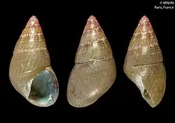 The coloration is quite variable with even unicolored green specimens. The aperture is sometimes so dilated that the spire seems to lean to that side.[4]