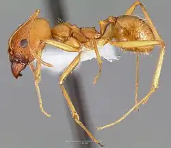 Pheidole vistana is a species of big-headed ant native to Nevada, Arizona, California, Baja California, Baja California Sur, and Sonora.[1][2][3][4][5] Its diet apparently consists of only insects, and many workers will cooperate to efficiently transport prey into the nest. It is a primarily nocturnal species that may rarely forage on overcast days. Large rings of sand often surround its nest entrances.[6]