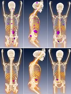 Top: Purple lesions are metastatic disease detected with DOTATATE imaging. Bottom: Same patient. Purple lesions are metastatic disease detected with FDG PET