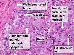 Paragangliomas and pheochromocytomas exhibit a characteristic nested (Zellballen), trabecular, or solid arrangement of tumor cells, with nests outlined by sustentacular cells that are best visualized using S100 immunostain. The tumor cells are typically large, polygonal, and uniform but may also display extensive vacuolation. The cytoplasm is abundant and finely granular, ranging in coloration from red to purple. Pigmented granules containing hemosiderin, melanin, neuromelanin, and lipofuscin may also be observed. Nuclei can vary extensively in size and shape, presenting as round to oval with prominent nucleoli.