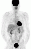 FDG PET — the tumor is appreciated as the dark structure in the patient's left chest. The darkened structure at the head of the patient is the brain, posterior to the abdomen are the kidneys, and in the pelvis is the bladder. These are normal.