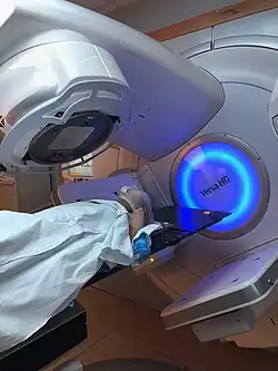 Patient receiving radiation therapy to the region of the head and neck. Full facial mold is in place to protect areas where they do not want exposure.