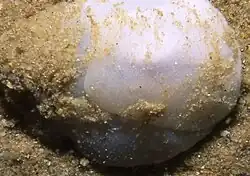 Its egg masses are translucent, sausage-shaped and are attached to sandy bottoms by long mucous threads.