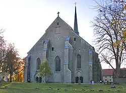 Her particular interest in Sweden was Vadstena Abbey, which came to be a refuge for her and a base whenever she was in Sweden. Her English entourage had included Henry Fitzhugh, who had visited the Abbey with an English delegation for members in order to establish a Bridgettine monastery in England, and in 1415, four nuns, three female novices, one monk and one priest left the abbey under great celebrations for the foundation of what became the famed Syon Abbey. Philippa herself likely saw Vadstena for the first time in 1408, when she would have accompanied Eric there. During her second visit to Vadstena Abbey in January 1415, she followed the example of Queen Margaret and was accepted as a soror ab extra.[4] In 1421, she made a donation to the Abbey in exchange for prayers for her, her spouse and her parents; in 1422, she delivered the relic of an arm from Canute the Holy to the Abbey, and in 1425, she donated the Choir of Saint Anne, whose inauguration she attended the following year.[4] When Pope Martin V banned double monasteries in 1422, Queen Philippa and her spouse sent an embassy to Rome to ask for a retraction of the ban, and she also asked her brothers in England to intervene: the result was that an exception from the ban was made for the Bridgettine Order.[4]