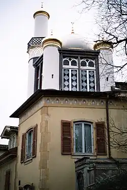 He also tried introducing silkworm culture in Switzerland in 1837, but the silkworms were destroyed during an epidemic in 1843.[15] As a result of his travels in the Middle East, he had an addition to his home built, topping it with minarets.[9]
