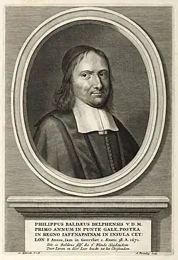 For a year and a half Philips studied philosophy, logic and oriental languages in Groningen (1649) and then theology in Leiden (1650-1654). In 1654 he married Maria van Castel (-1655), his cousin.[10] After discussions with Arnoldus Montanus, he went into the service of the Dutch East India Company. Baldaeus left in October 1654 together with his wife. He lived from July 1655 in Batavia, Dutch East Indies, went to Makassar, Malacca and remarried Elisabeth Tribolet on board of a ship and on his way to Ceylon.[9]