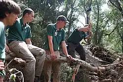 There are six divisions of the Conservation Department in the summer, each led by an Associate Director of Conservation – Work Crew, Forestry Crew, Conservationists, GIS, Environmental Education (ROCS, Trail Crew Trek), and Order of the Arrow Trail Crew. Work Crews are staff groups responsible for maintaining and creating campsites and trails. Trail Crews and other staff, known as Advanced Teams, are the first Conservation staffers to begin hiking and clearing the trails one month before the first participants arrive. Conservationists live in staff camps or spike camps and lead conservation projects for treks passing through their camp. The GIS staff map trails, campsites, and other features of the Philmont Backcountry. In recognition of the 100th anniversary of the BSA, Northrop Grumman donated high-resolution geospatial data of the ranch to Philmont. GIS and the Conservation Department use the data to create enhanced maps and improve conservation efforts throughout the ranch. The Division of Forestry's priority is forest fuel reduction. Using chainsaws, a masticator, a skidder, and a portable sawmill, these crews create defensible space around staff camps and strategic shaded fuel breaks to reduce the risk of catastrophic wildfire and improve the health and productivity of Philmont's forests while utilizing the wood in construction projects around the Ranch. Slash from the thinning projects is piled and burned, and a prescribed fire program is being developed to maintain desired forest conditions. The Forestry crews work year-round, and each staff member receives detailed training in chainsaw operations, as well as an overview of forest management and fire ecology.[10]