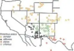 | Distribution of P. elatus, modified from Brown, 1971. Each symbol represents a published record, and colors indicate the ranges of the four subspecies. | |