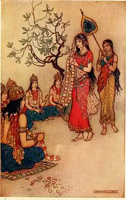Meanwhile, Indra, the king of the gods, learnt from Narada the news of Damayanti's swayamvara and of her steadfast love for Nala. Natural fascination to win the hand of a damsel goaded Indra to attend the swayamvara. He got down to earth with the gods Agni, Yama, Varuna and Shani (Saturn) and met on his way Nala, who too was proceeding to attend the swayamvara. He was unable to contain his envy on noticing Nala's enchanting appearance and so resorted to a ruse by requesting Nala to be the emissary of the gods and impress upon Damayanti their unequalled worthiness. The rewards that are vouchsafed traditionally to one who offers his service to another in need were brought by Indra to the notice of Nala, who was otherwise unwilling and at the same time felt the delicacy of refusing the request of the divine beings. At last, he agreed and was sent to the harem of Damayanti, remaining invisible to others — a boon granted to him by the gods.[6]