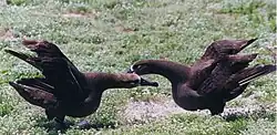 The black-footed albatross, along with the Laysan albatross and the rare short-tailed albatross, are the three species of albatross that range in the northern hemisphere, as opposed to the rest of the family which range from the Equator south. There are at least 12 known breeding locations, but 97.5% of the total population is found colonially on the isolated Northwestern Hawaiian Islands, from Kure Atoll to Kaula Island,[3] (such as Laysan, Midway, and the French Frigate Shoals). Small populations can be found on the Japanese islands of Tori Shima, Bonin, and Senkaku, and off the Mexican coast, primarily on Isla Guadalupe.[14] They are extirpated from the Iwo Jima, Agrihan, Taongi Atoll, Marcus Island, Wake Island, and Johnston Island.[3] Their range at sea varies during the seasons (straying farther from the breeding islands when the chicks are older or they don't have chicks) but they make use of great areas of the North Pacific, feeding from Alaska to California and Japan; however they do prefer the northeastern Pacific Ocean.[14] They overlap greatly in breeding and feeding range with the other two species of northern albatross, although the other two will range further north into the Bering Sea than the Black-footed will. They have, on occasion, been sighted in the southern hemisphere.[14]