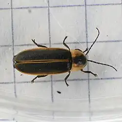 P. tenuicinctus is a medium-sized beetle, with adults that measure about 8.5–11.5 mm (0.3–0.5 in) long. The head shield, or pronotum, is pale yellow with a dark central mark that is broader at the top, slightly narrowing posteriorly and almost reaching the base of the pronotum. The wing covers, or elytra, are dark with very narrow light-colored margins. The male has lanterns in segments 6 and 7 of its abdomen, and the female has only one lantern.[5] The male has elytra that extend the length of its abdomen, but the female is brachypterous and cannot fly, with short elytra that reach only slightly beyond its first abdominal segment.[6]
